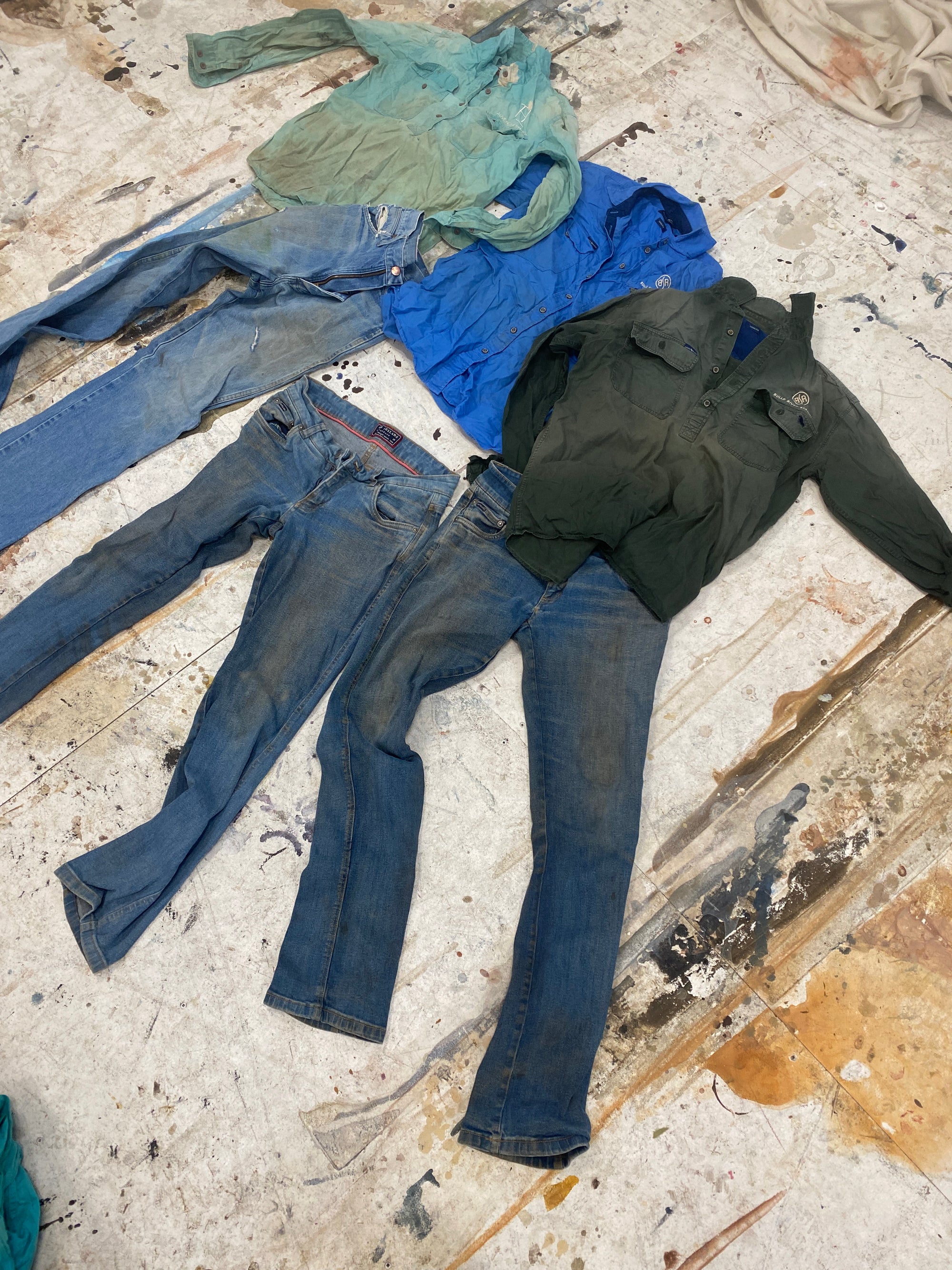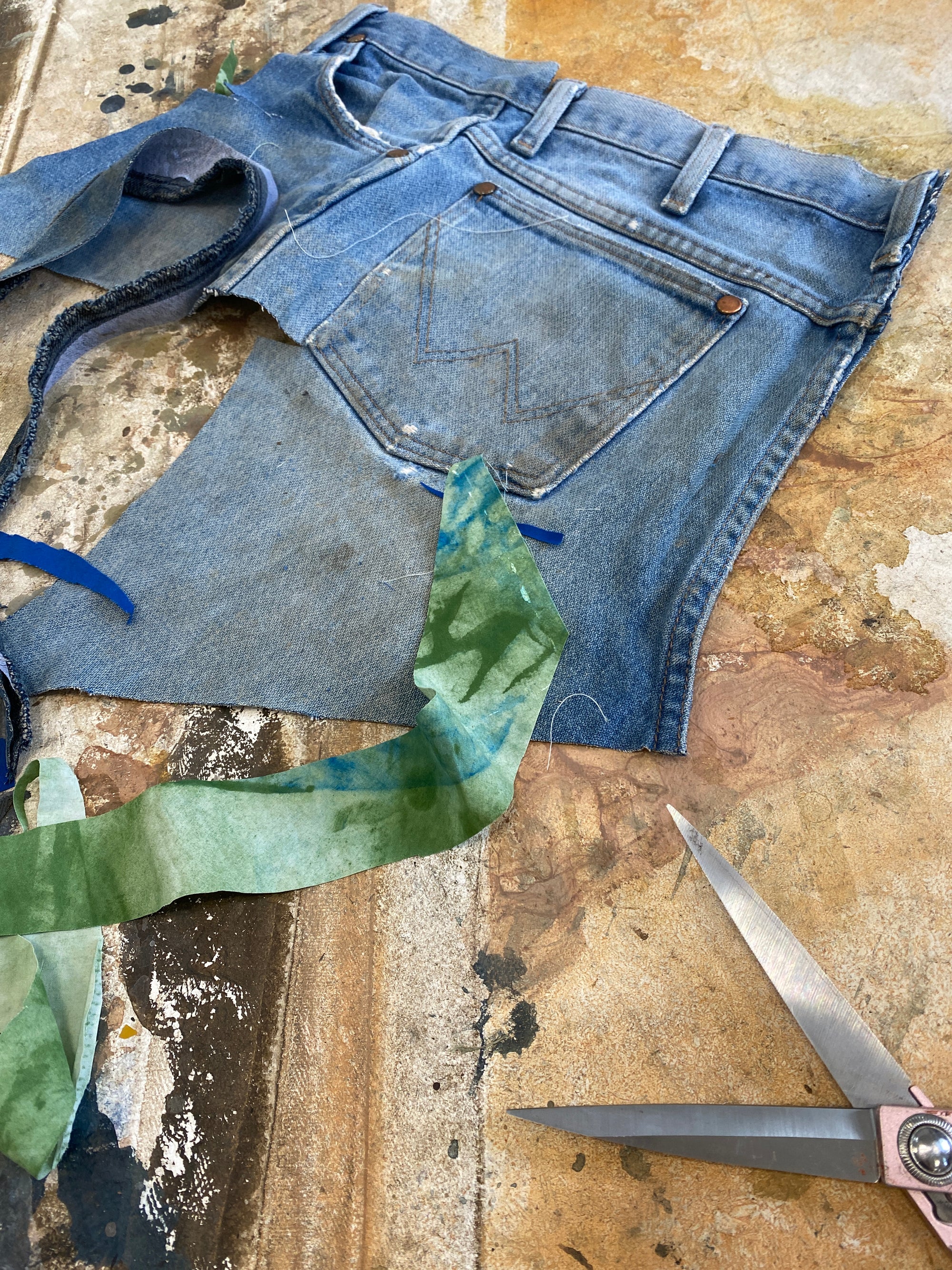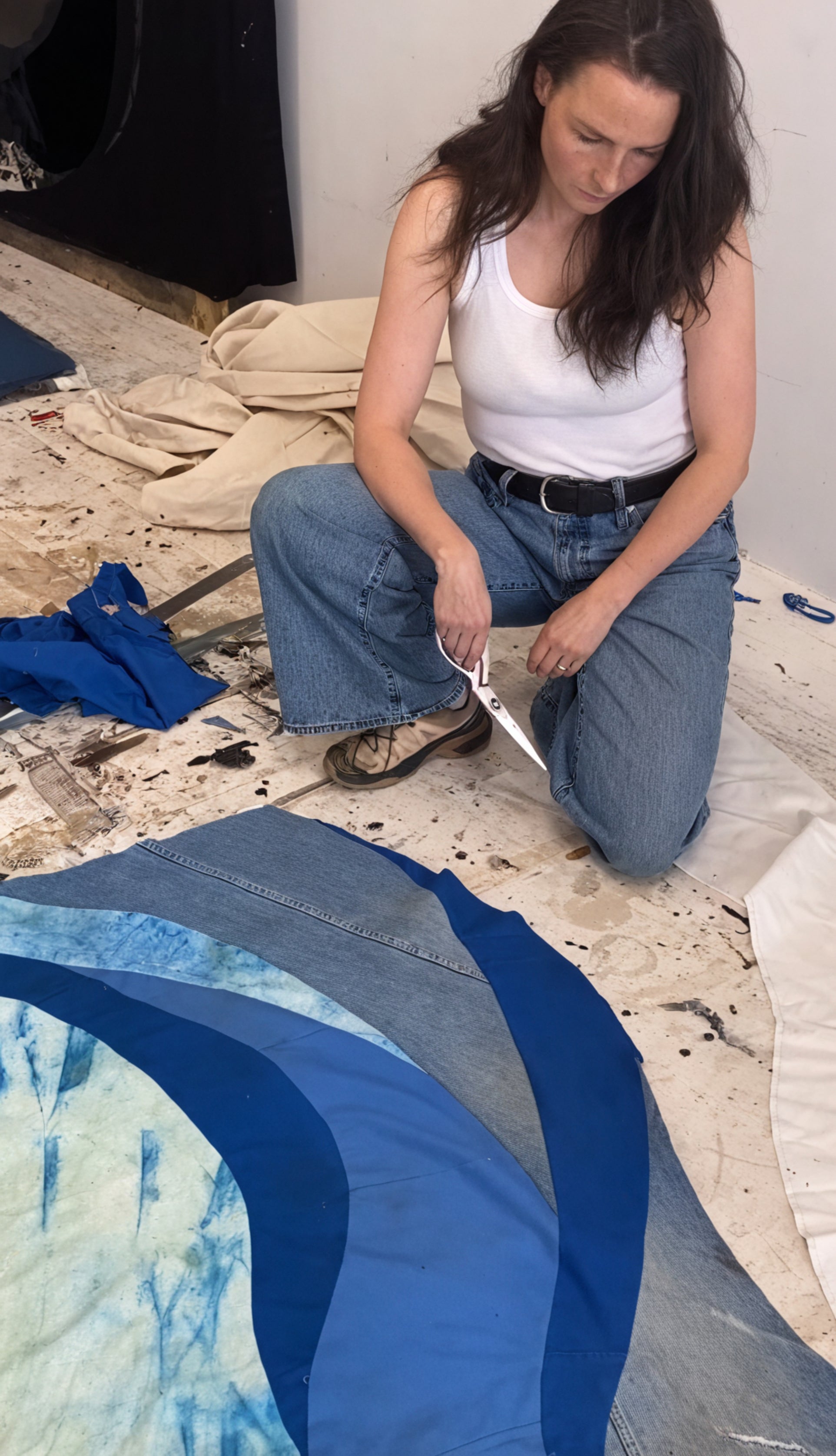 Meg visited Bullo River Station in July 2025 as their first artist-in-residence, and spent time being inspired by the property's vast lands, vivid nature-based colour palette, and the enthralling stories of the station's ringers. During her stay she also collected old denim jeans, paisley bandanas, and sun-faded green cotton workwear, all once worn by the Bullo team, with each piece of material etched with unique fading and marks from years of use.