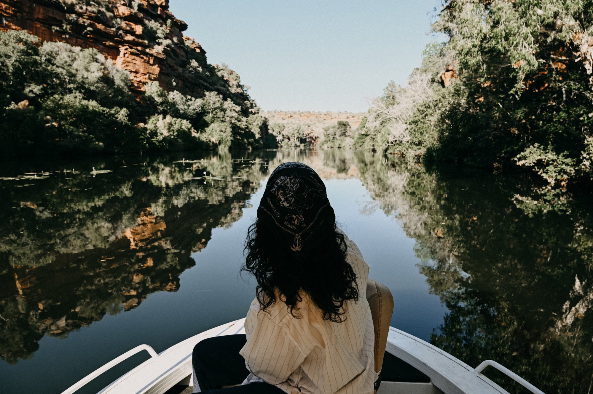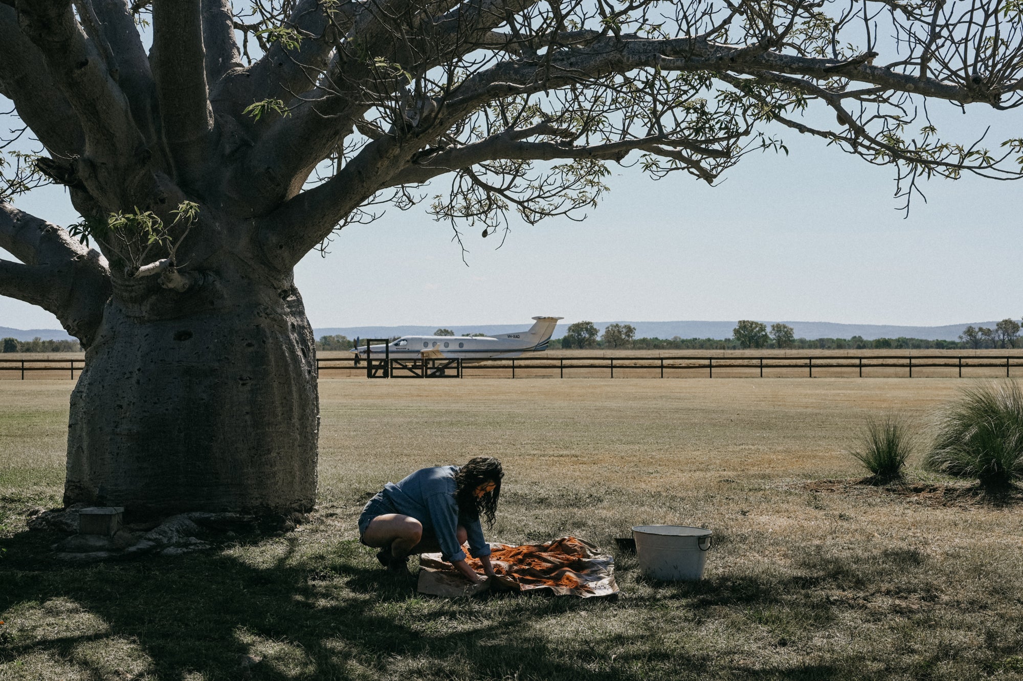 I dyed cotton by hand with Bullo's land, using red ochre from the earth itself, anchoring the work in its origins. The colours that stayed with me long after leaving were the bold blues and dense greens. They contrasted so beautifully together, the water mirroring the rugged terrain and the piercing blue sky.