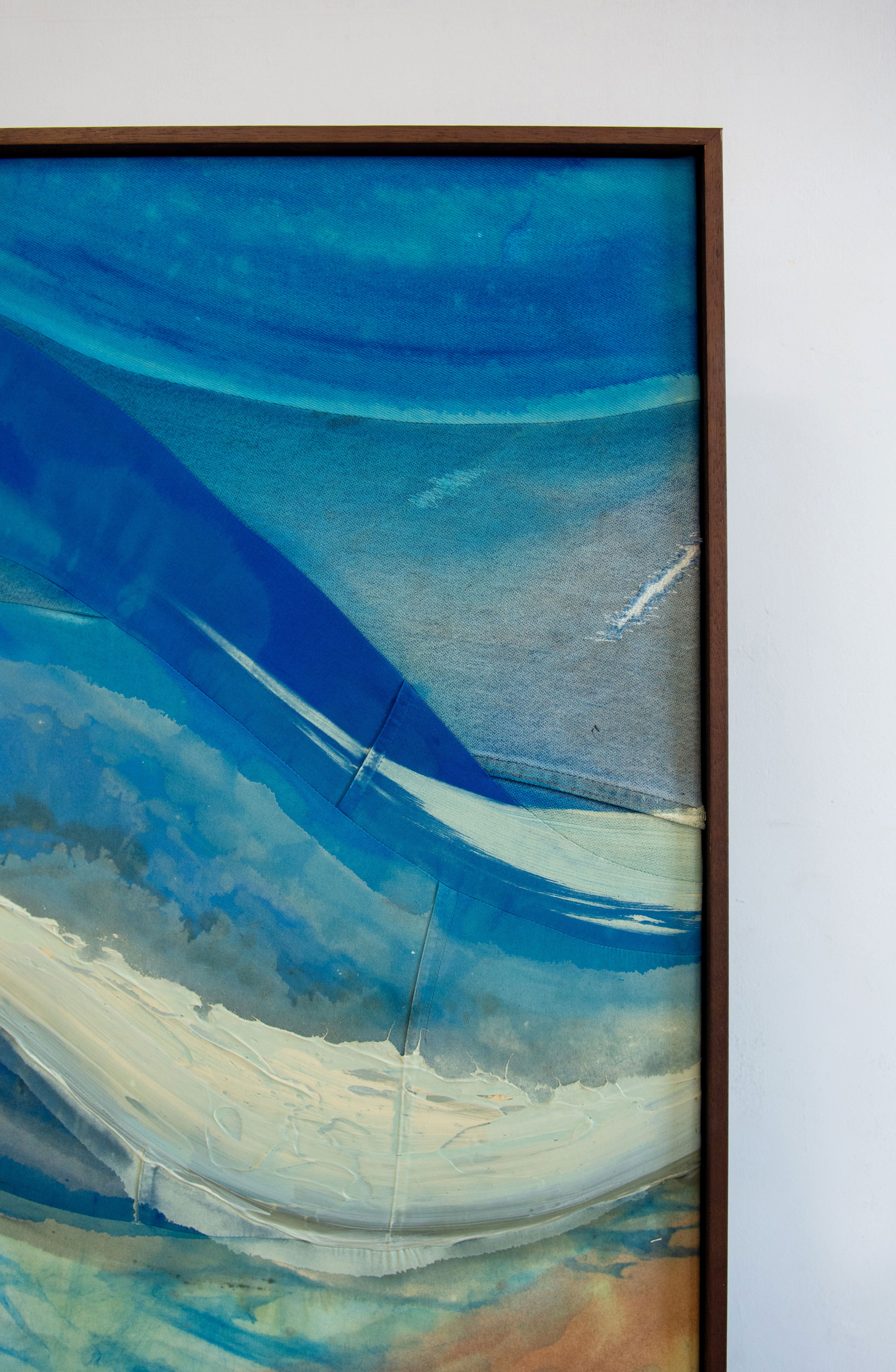 To honour that complexity, I intertwined all these elements within the composition, allowing them to flow into one another like the natural rhythms of the station. My materials are as much a part of this story as the imagery itself. I incorporated denim jeans worn by the Ringers, preserving their creases and repairs as traces of hard days under the sun. I like to think that memories are embedded in fabric. Their work shirts also find a place here, carrying the essence of those who care for this land.